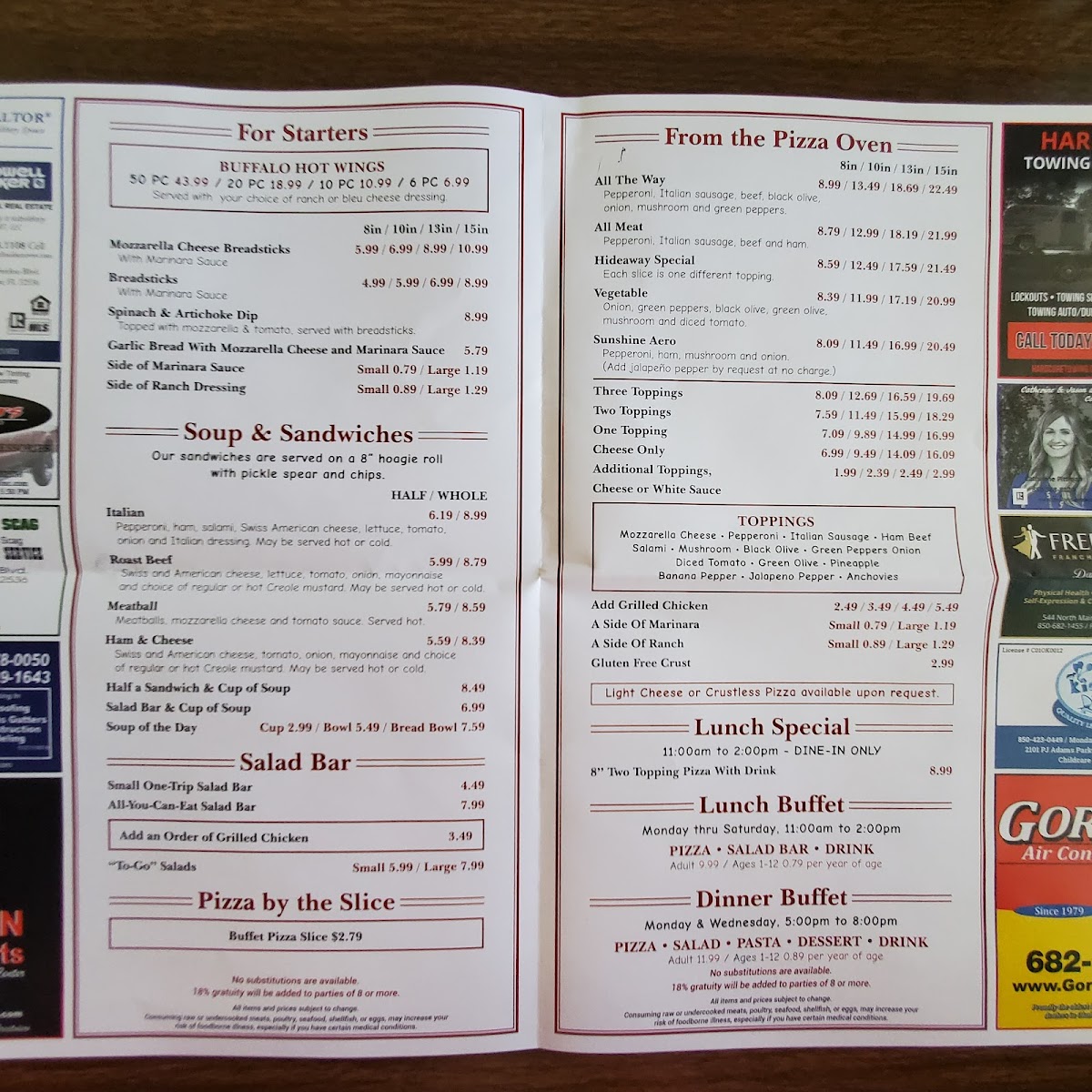 Welcome to Hideaway Pizza - Crestview, a gem located at 326 N Main St, Crestview, FL. This delightful eatery boasts a diverse menu that captures the essence of authentic pizza. Their signature creation remains the thick, deep-dish pizza, laden with rich marinara sauce and generous toppings, ensuring every bite is an explosion of flavor. Customers rave about the Buffalo Hot Wings, available in various portion sizes, served with a choice of cooling ranch or tangy blue cheese.